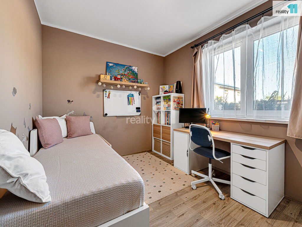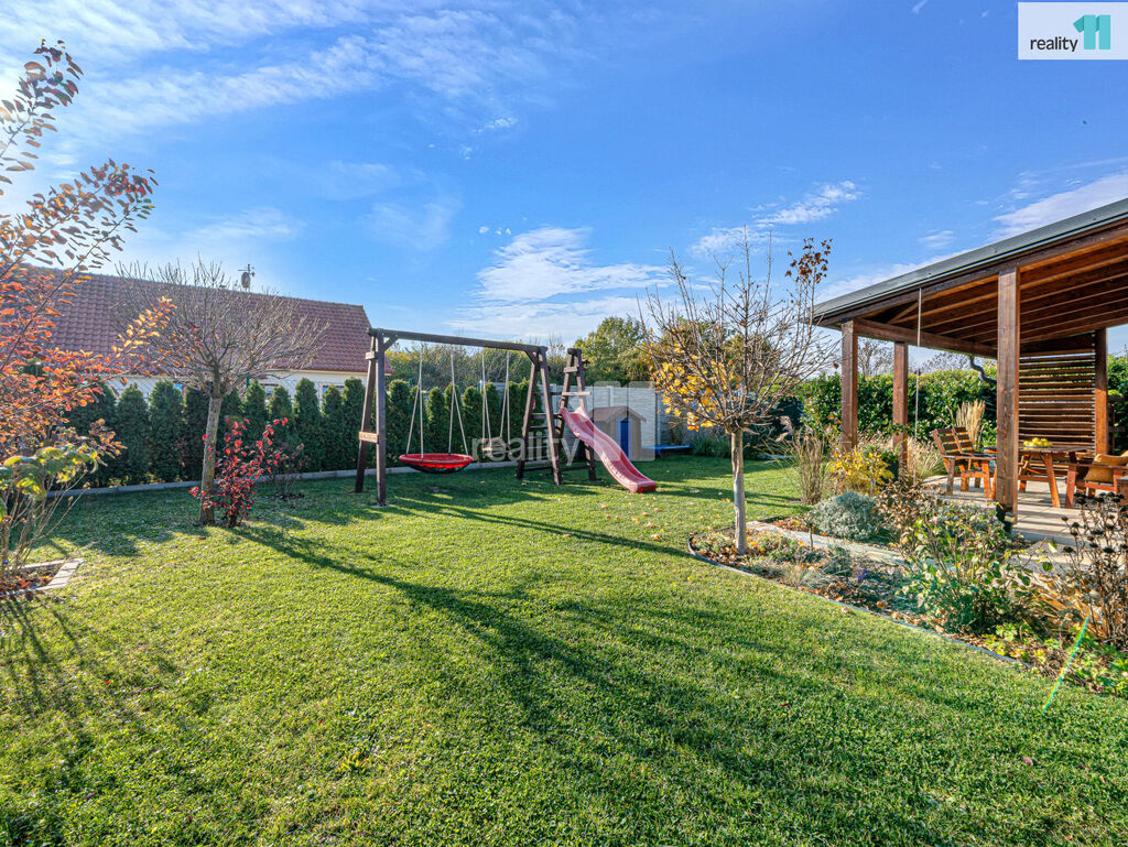 Zahrada je pečlivě udržovaná, s dostatkem prostoru pro odpočinek i dětské hry. Najdete zde zastřešené posezení pod pergolou, zahradní domek i elektricky ovládanou vjezdovou bránu.