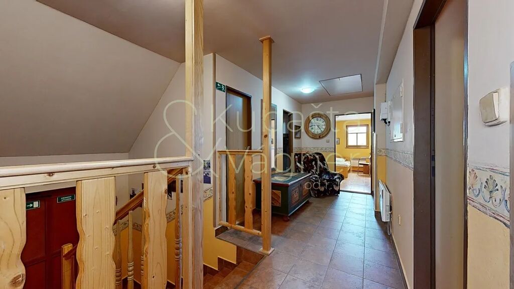 Po schodišti se dostáváme do podkroví, kde je pět krásných zařízených, vybavených a neprůchozích pokojů (výměry: 11,6 m², 11,9 m², 14,8 m², 15,7 m², 12,1 m²) a dětský pokoj (6 m²). Každý pokoj disponuje vlastní koupelnou s toaletou a je vybaven posteli, nočními stolky, skříněmi atd. Navíc v podkroví najdeme infrasaunu se sprchou, dále pak úklidovou místnost a sklad textilu. Zároveň je na chodbě stahovací žebřík na půdu.