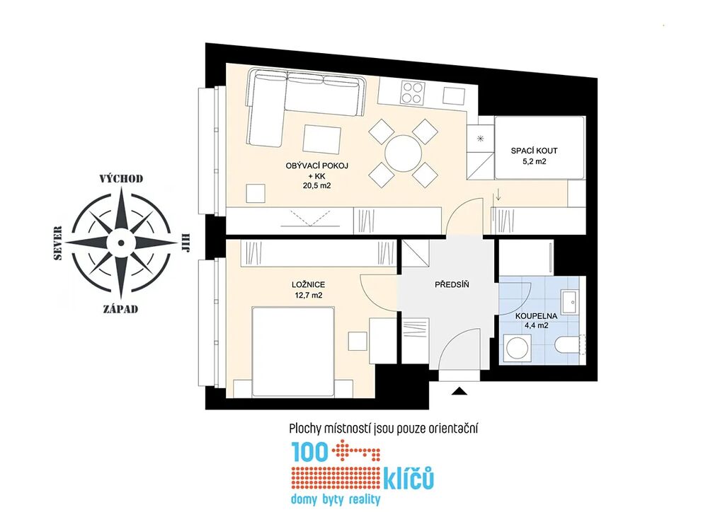 Byt má 50 m² podlahové plochy, je plně vybaven a patří k němu parkovací stání v podzemní garáži a vlastní sklep.