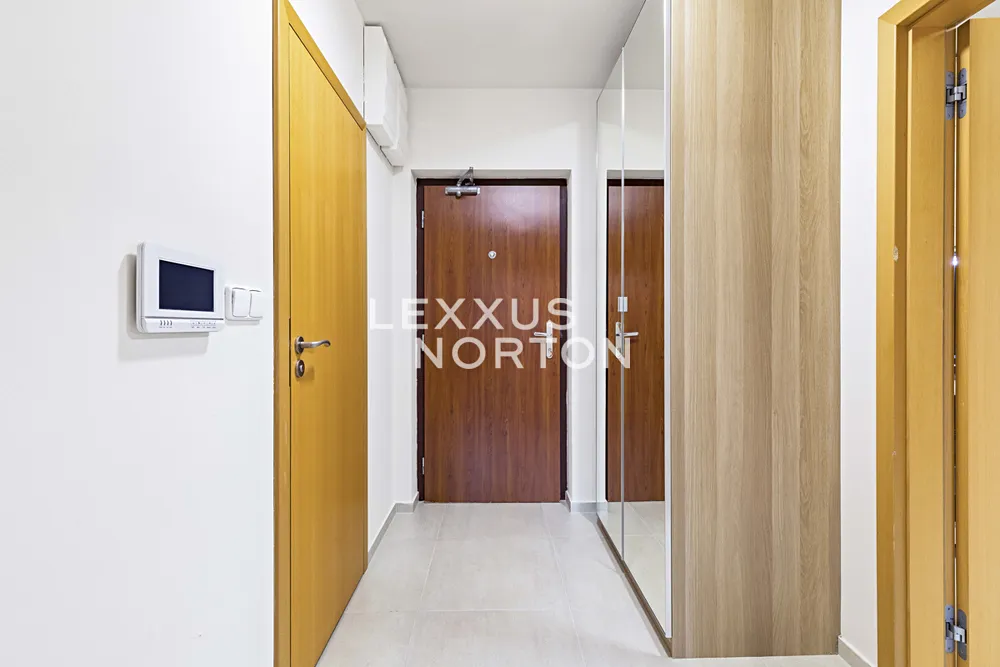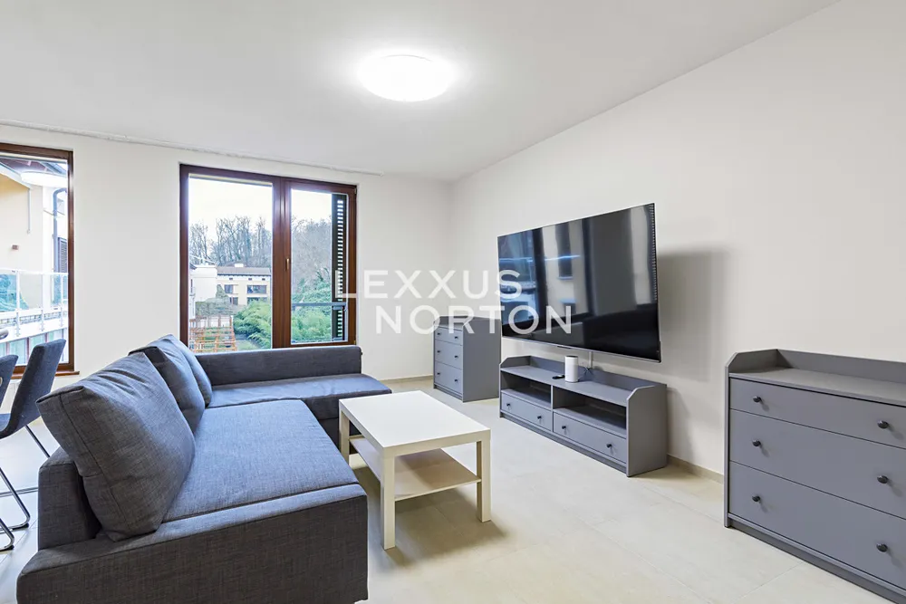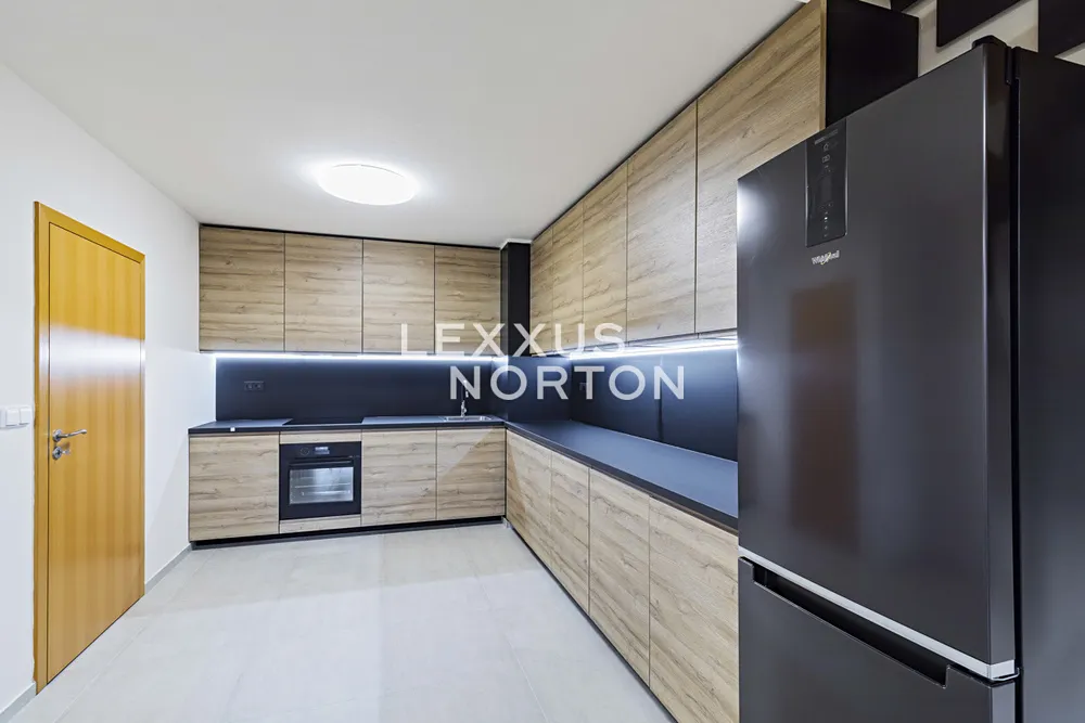 Byt je zařízený a je vybavený kuchyňským koutem včetně spotřebičů (indukční deska, trouba, lednice, mrazák a myčka nádobí), 2 koupelny - jedna se sprchovým koutem a druhá s vanou, sedací souprava, postel, televizní stolek a televize. K vybavení domu patří společné fitness a také sauna.