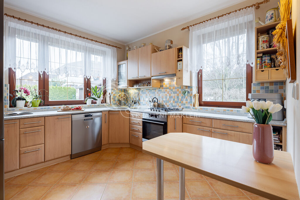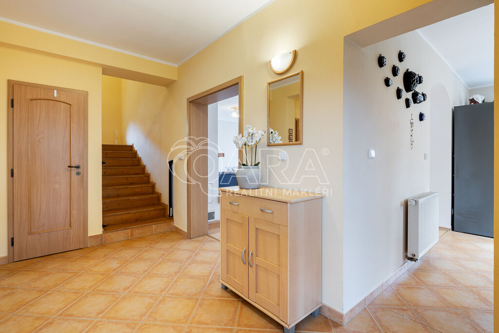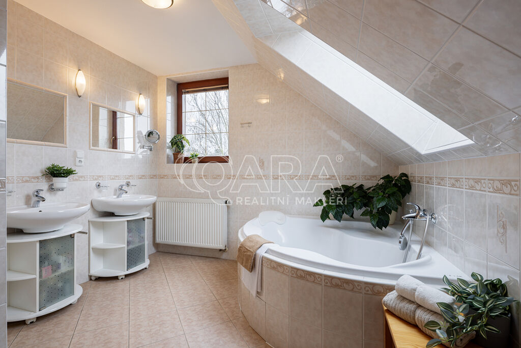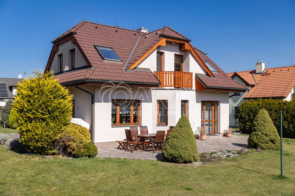 Dům z roku 2004 je dispozičně řešen jako 6+1 s garáží a je ve velmi dobrém stavu. Přízemí využíváno jako společenská zóna: obývací pokoj s krbem a navazující terasou, samostatná kuchyně s komorou, pracovna, hala se schodištěm, koupelna se sprchovým koutem a samostatné WC. V patře se nachází čistě soukromá část, kterou tvoří 4x ložnice (tři ložnice mají vstup na balkon), hlavní koupelna s vanou, sprchovým koutem a s WC, chodba a menší koupelna se sprchovým koutem a s WC. Posledním prostorem v domě je půda (úložný prostor pro lyže, kufry, sportovní vybavení a sezonní potřeby pro celou rodinu).