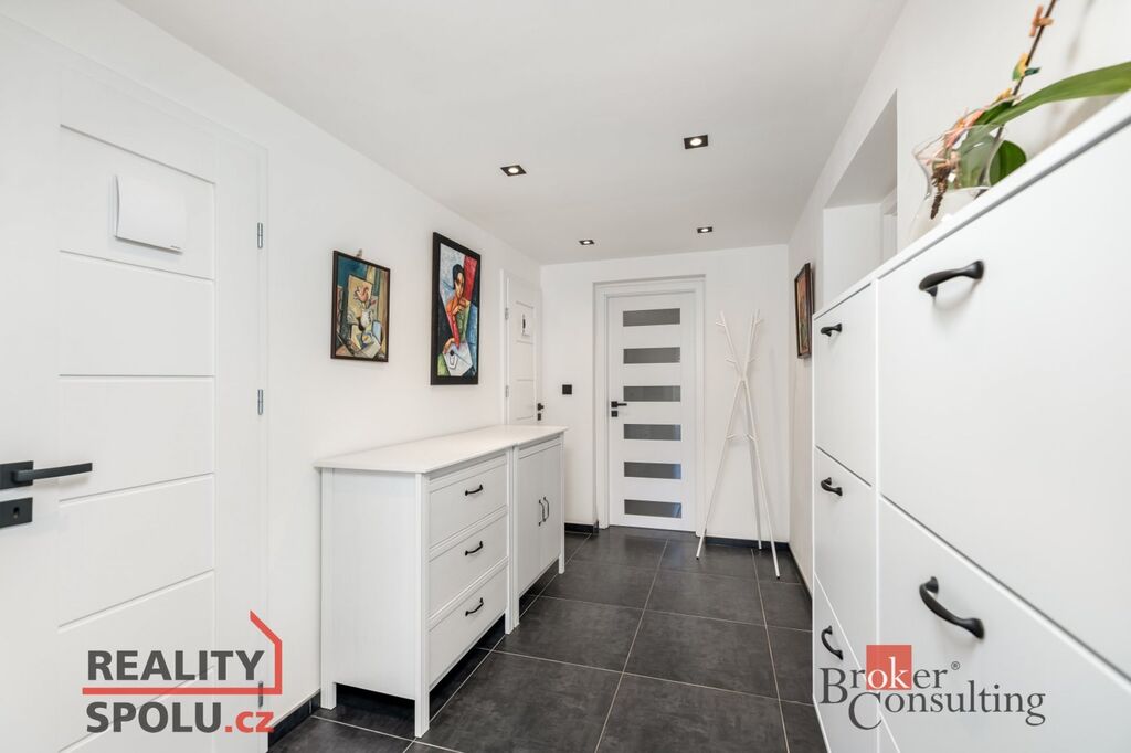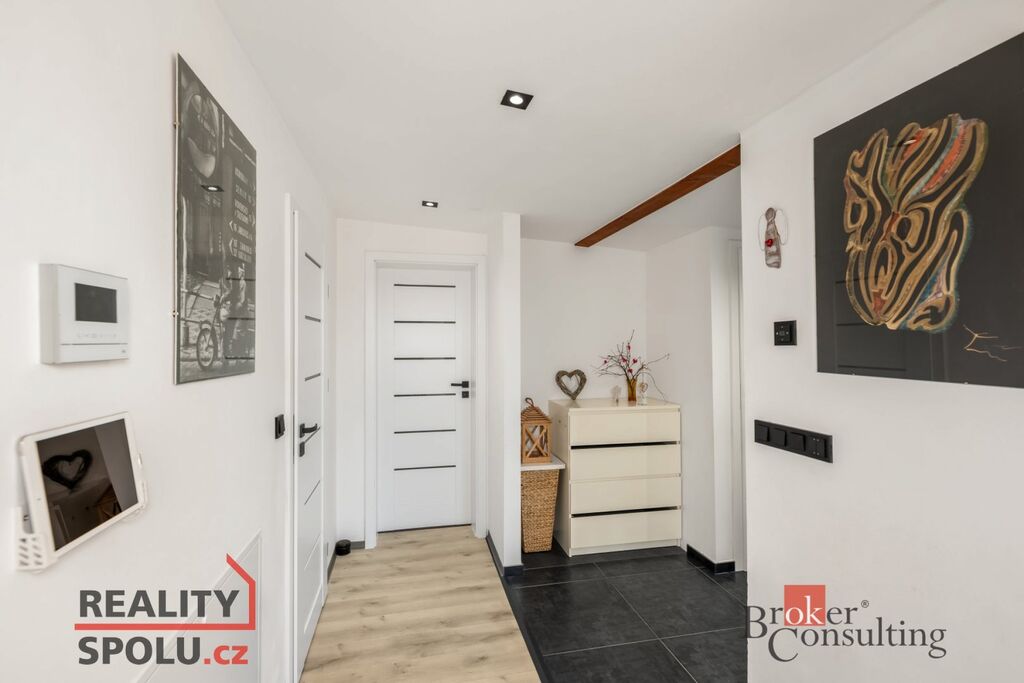 Přímý vjezd, dálkově ovládaná brána, připojení na kanalizaci, obecní i vlastní zdroj vody, internet. Na každém podlaží ovládání topení zvlášť, v koupelně topný žebřík. Fasáda modřín, podlahy vinyl, střešní okna Velux.