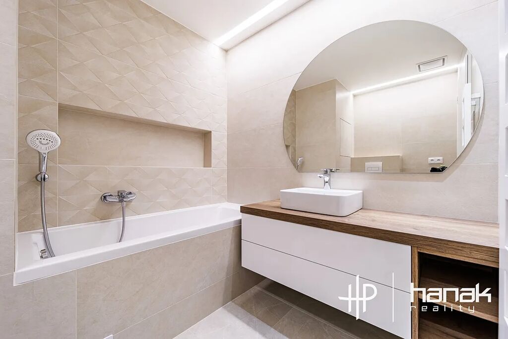 Dispozice bytu nabízí zádveří se vstupem do praktické šatny a do koupelny s vanou, umyvadlem, toaletou a místem pro pračku se sušičkou.
