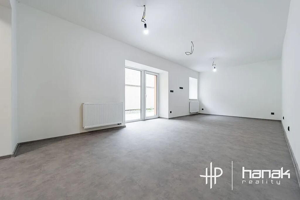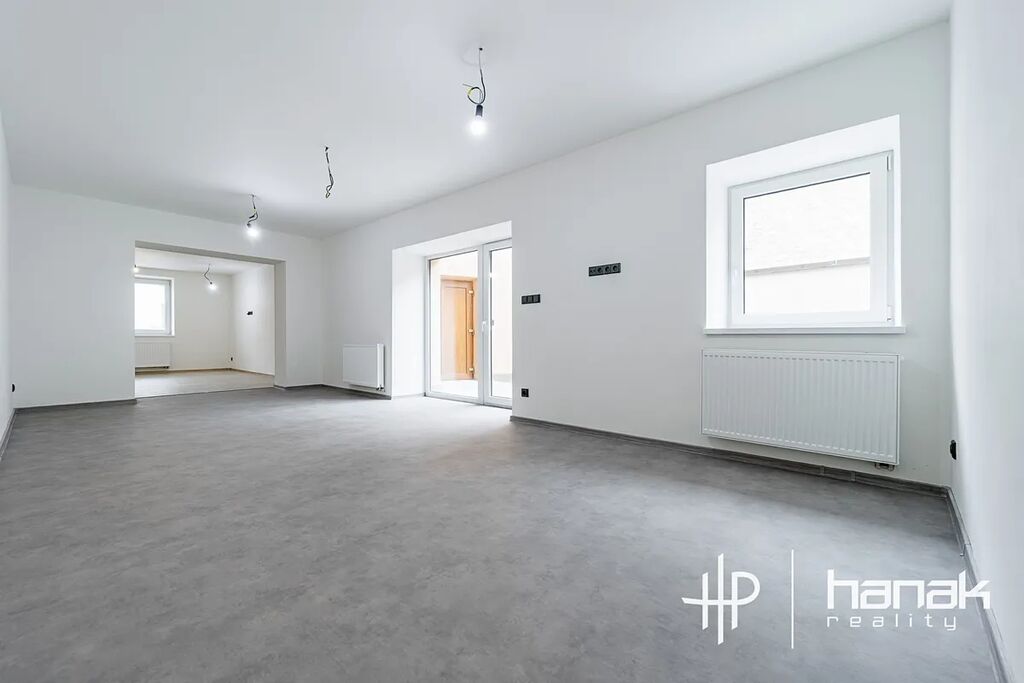 Dispozice v přízemí nabízí prostornou chodbu s průchodem do dvorní části, koupelnu s toaletou a vanou, technickou místnost, velkorysou kuchyni a místnost (38 m2), kterou lze příčkou rozdělit na dva pokoje.