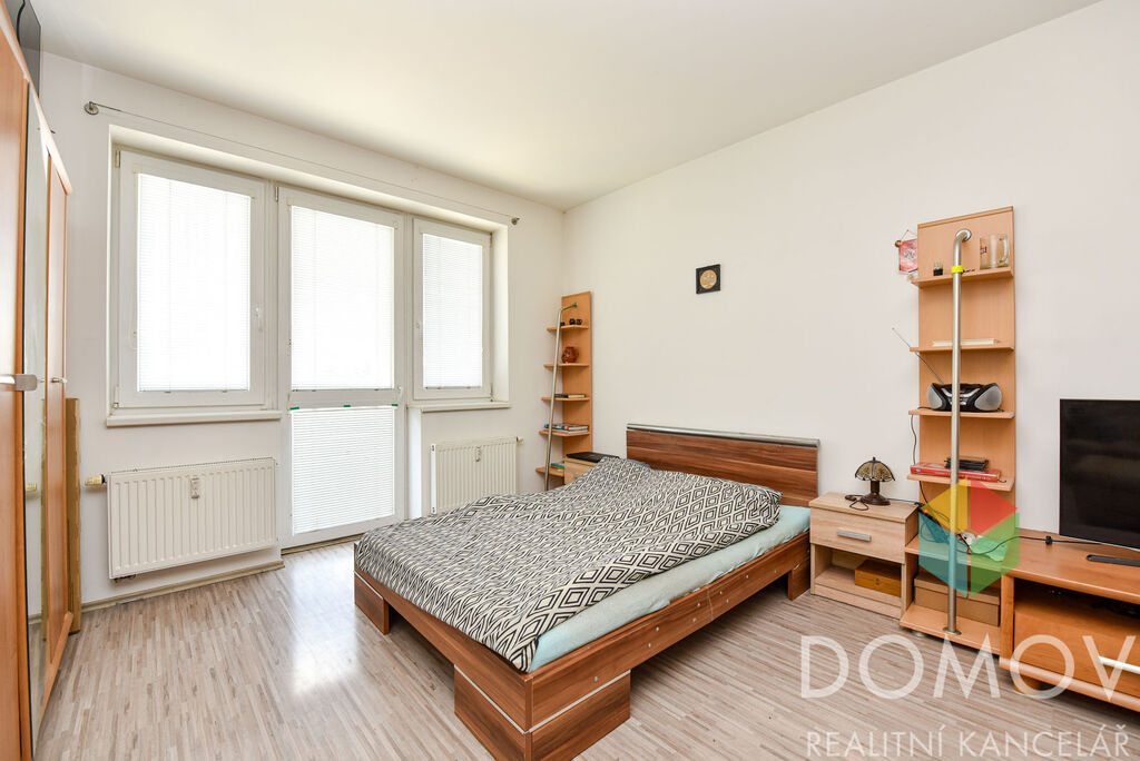 Na obývací prostor s kuchyňským koutem navazuje balkon o velikosti 1,8 m2. Na fotkách je nábytek předchozího nájemce, nyní je byt prázdný. V koupelně s toaletou je dále vana a umyvadlo. Kuchyňský kout je vybaven sklokeramickou varnou deskou, troubou adigestoří. Okna jsou plastová, na podlaze lamino.