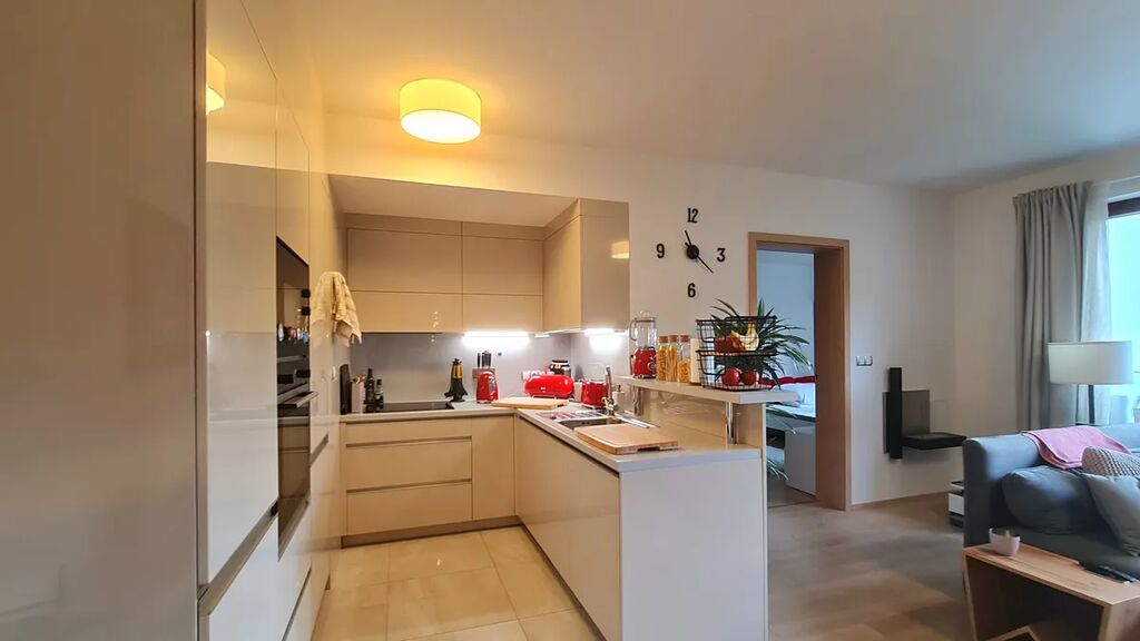Kuchyň potěší každého gurmána – je vybavena myčkou, elektrickou troubou, mikrovlnnou troubou, indukční varnou deskou a lednicí s mrazákem.
