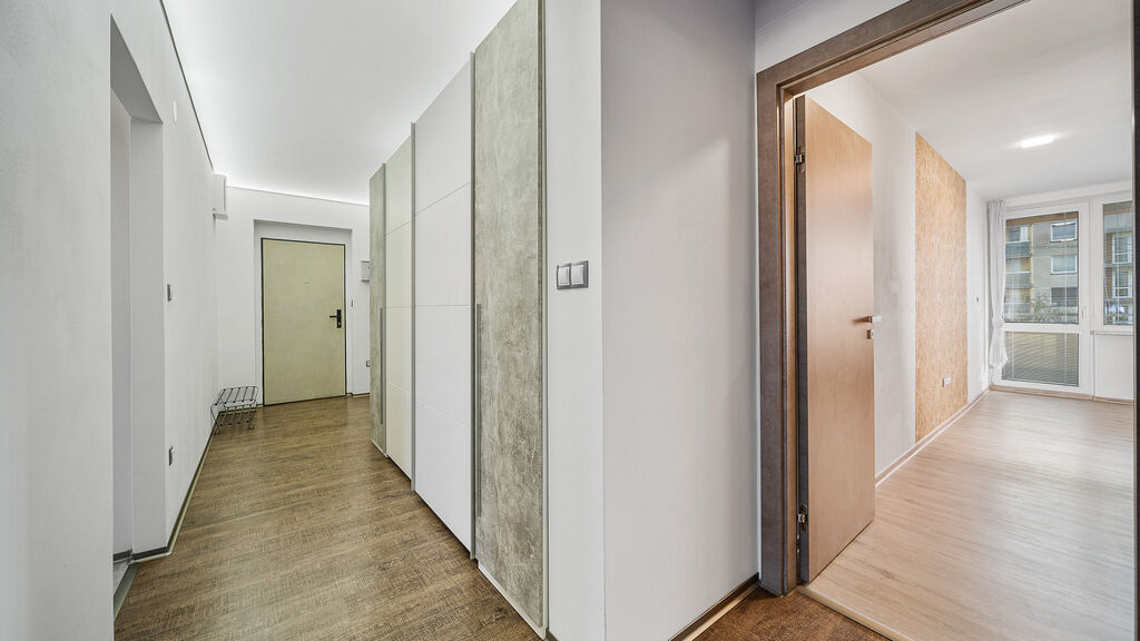 • Úložný prostor: V bytě je vybudovaná šatna a na chodbě stojí vestavěná skříň.