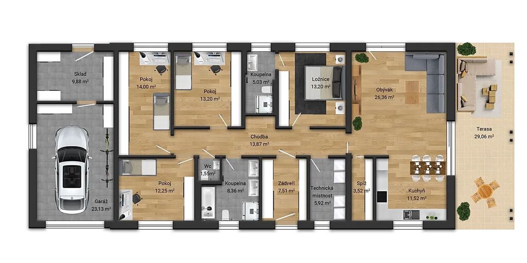 – z prostoru obývacího pokoje se dostanete na úžasnou zastřešenou terasu (29 m2), která může sloužit jako prodloužení obytné části a kde si užijete společných odpočinkových chvil s rodinou a přáteli