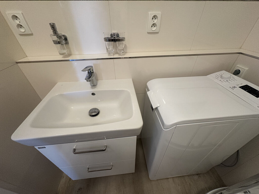 Dispozice bytu – samostatná kuchyňka s oknem (10 m²) a volným vstupem do pokoje (12 m²) s oknem + nová zděná koupelna se sprchovým koutem, koupelnový nábytek, WC součástí, místo na pračku šíře 400 mm přímo v koupelně. Byt je vybaven vkusnou rovnou kuchyňskou linkou / odstín bělený dub včetně elektrického sporáku se sklokeramickou varnou deskou, digestoř, vestavěná myčka 400 mm, vestavěná lednice, spížní skříň; nepostradatelnými úložnými prostory v předsíni – rohová vestavěná šatní skříň se zrcadlem, odstín buk + vestavěná rohová skříň ve výklenku. Čistě bílá výmalba, úsporná svítidla ve všech pokojích, bílé garnyže, venkovní bílé žaluzie / úplné zatemnění; v ceně nájmu televizní přípojka / základní programy. K dispozici je zcela bezpečná větší sklepní koje, společná sušárna a kočárkárna. Byt není aktuálně ještě vystěhován - fotodokumentaci doplním později.