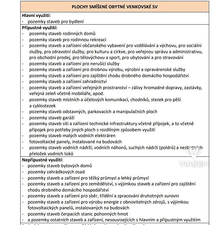 Dle regulativů územního plánu je na pozemku možná výstavba rodinného domu. Koeficient zastavitelnosti činí 0,30 a maximální výšková hladina zástavby je stanovena na jedno nadzemní podlaží. Pozemek nabízí také široké možnosti dalšího využití – přípustné jsou zde například stavby pro rekreaci, objekty občanského vybavení, drobná výroba, zahradnictví či výstavba garáže.