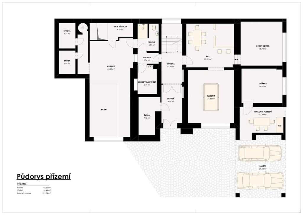 Vybavení je součástí prodeje. Příjezd po celý rok po asfaltové komunikaci. Vlasní parkovací stání 6x z toho 2x kryté. Na nemovitosti neváznou žádná břemena, či jiná zástavní práva. Těšíme se na osobní setkání, spolupráci přímo na Benecku spojenou s prohlídkou domu..