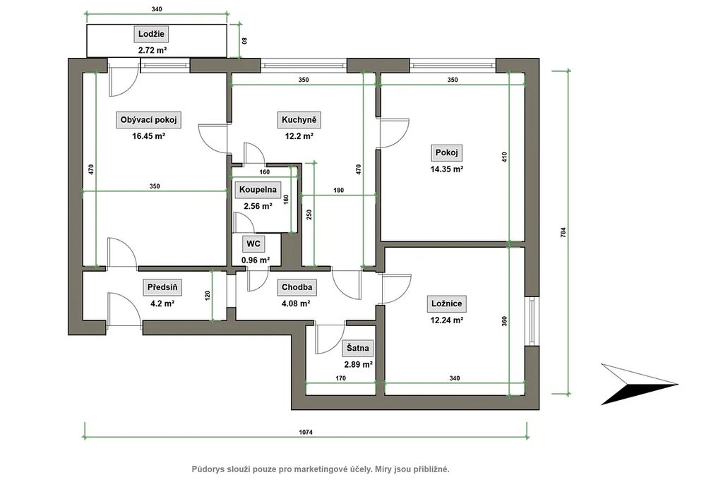 Plocha bytu je cca 71m². Byt se nachází v 2.NP s novým výtahem. Byt má zasklenou lodžii ze které je výhled na okolí a velikou šatnu v bytě.