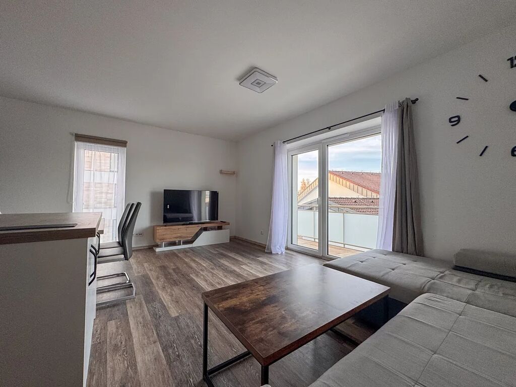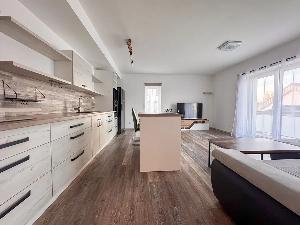Dominantou bytu je prostorný obývací pokoj s moderní kuchyní a vstupem na rohový balkon. V obývací části je pohodlná rohová sedačka, konferenční stolek, televizor a jídelní stůl. Kuchyňská linka nabízí dostatek úložného prostoru a je plně vybavena spotřebiči včetně americké lednice, trouby, mikrovlnné trouby, varné desky a digestoře. Balkon, který je přístupný pouze z obývacího pokoje, poskytuje dostatek soukromí a příjemný prostor k odpočinku.
