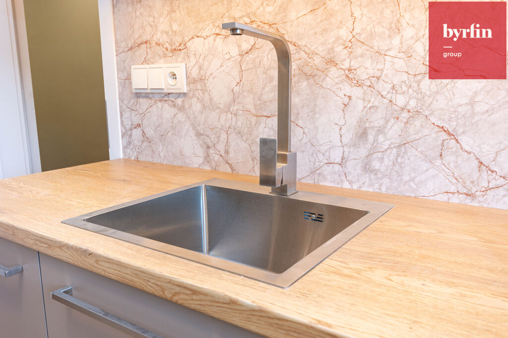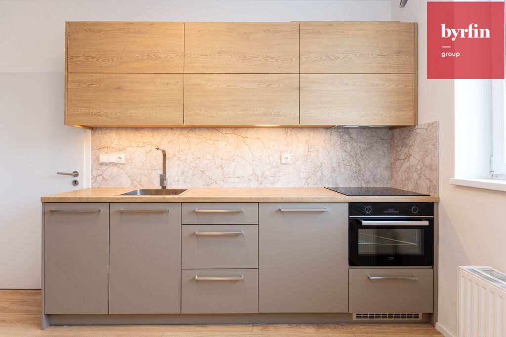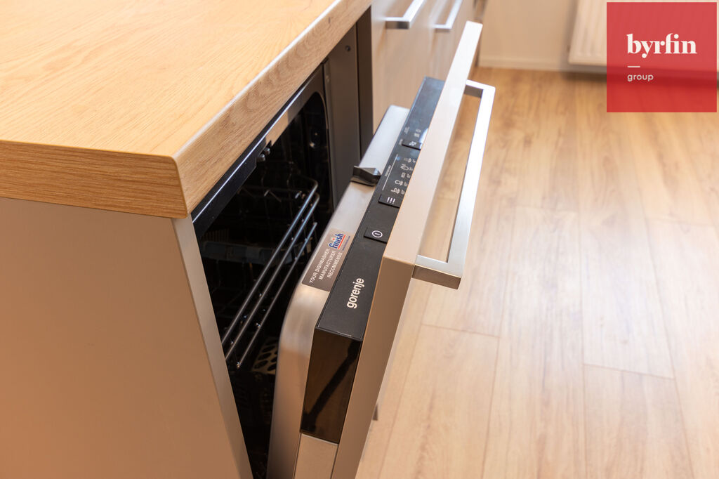 Součástí bytu je také kuchyňská linka na míru v moderním designu, vybavená kvalitními spotřebiči - myčkou, lednicí, pračkou, indukční varnou deskou, vestavěnou troubou a digestoří.