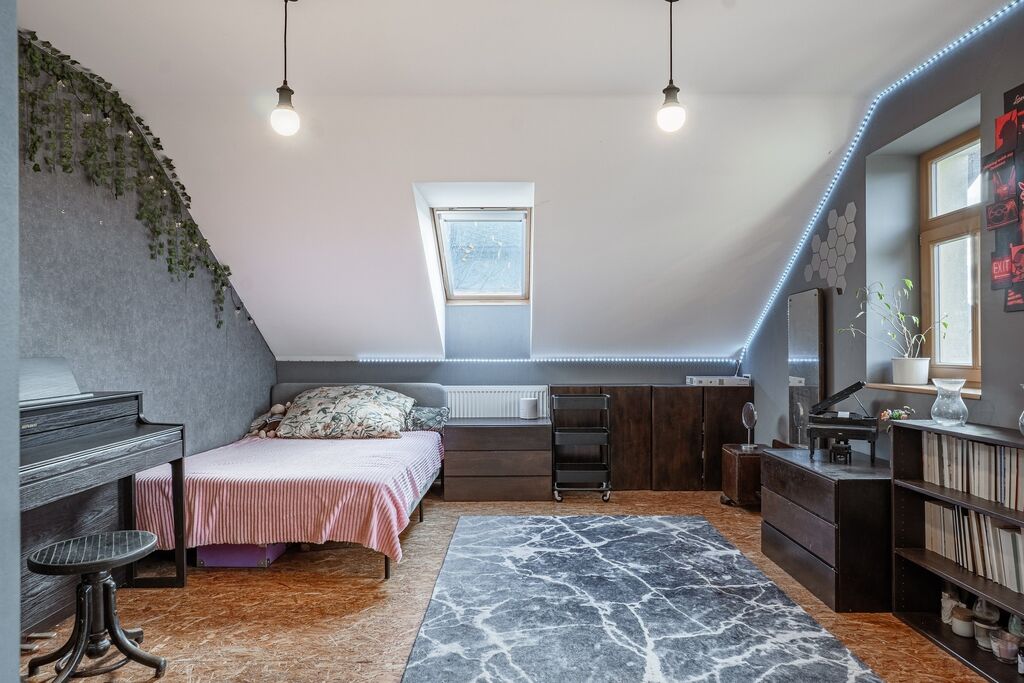 V patře se nachází dva dětské pokoje, každý s vlastní šatnou, a prostorná ložnice s dostatkem místa i pro pracovní kout. Na chodbě je pak samostatné WC.