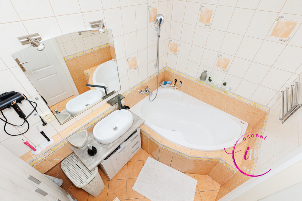Velkorysou koupelnu s rohovou vanou, kde se budete se sklenkou šampaňského cítit jako v luxusním wellness.