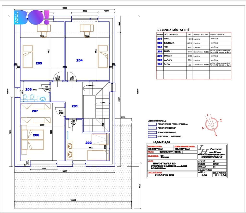 V prvním patře je hala o dispozici 16,2 m², koupelna 8,25 m², WC 3 m², pokoj 1 o velikosti 21 m², pokoj 2 o velikosti 21 m², ložnice o rozloze 20 m² a šatna 5 m².