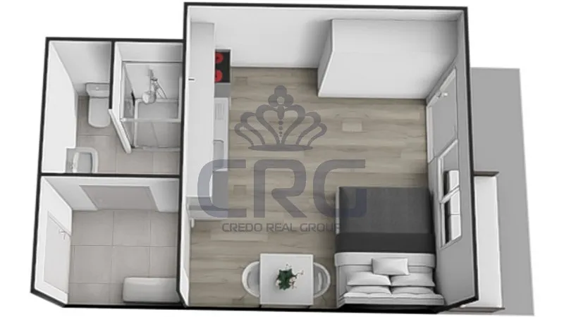 Vstupními dveřmi vejdeme do bytu a nacházíme se v chodbě o velikosti cca 3,2 m2. Z této je vstup do koupelny a do hlavní obytné části s kuchyňským koutem a terasou. Koupelna o výměře cca 3,8 m2 a je laděna do tmavších odstínů a je vybavena moderním sprchovým koutem, topným žebříkem, umyvadlem a WC.