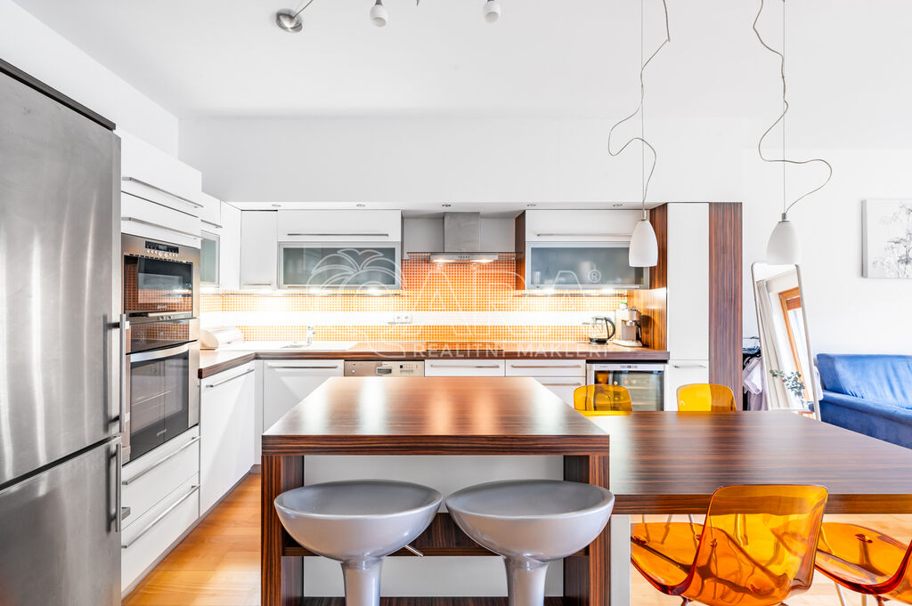 Byt je pronajímán částečně s vybavením. Plně vybavená kuchyňská linka (varná deska, el. trouba, digestoř, lednice, mrazák, myčka, mikrovlnná trouba, vinotéka), pracovní pult/ostrůvek, jídelní stůl s židlemi, sedačka, v ložnici vestavěná skříň. V koupelně s vanou je k dispozici pračka, toaleta, bidet. Dostatek úložných prostor, v chodbě šatní skříň, komora s policemi. V pokojích plovoucí podlahy, v koupelně a chodbě dlažba.