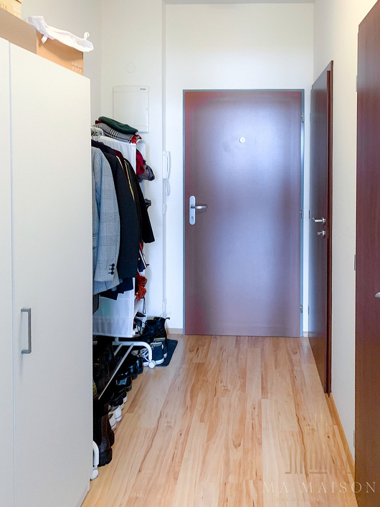 Byt se nachází ve 8. patře bytového domu s výtahem a sestává: ze vstupní předsíně, koupelny se sprchou, toaletou a umyvadlem. K dispozici je také pračka. Další místností je obývací pokoj s kuchyňským koutem. Kuchyňská linka je vybavena sporákem s digestoří a lednicí.