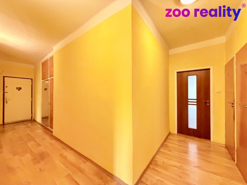 Najdeme zde dlouhou vstupní předsíň do tvaru L s vestavěnými skříněmi, kuchyni spojenou s obývacím pokojem, dva samostatné pokoje, toaletu, koupelnu s vanou a umyvadlem a komoru.