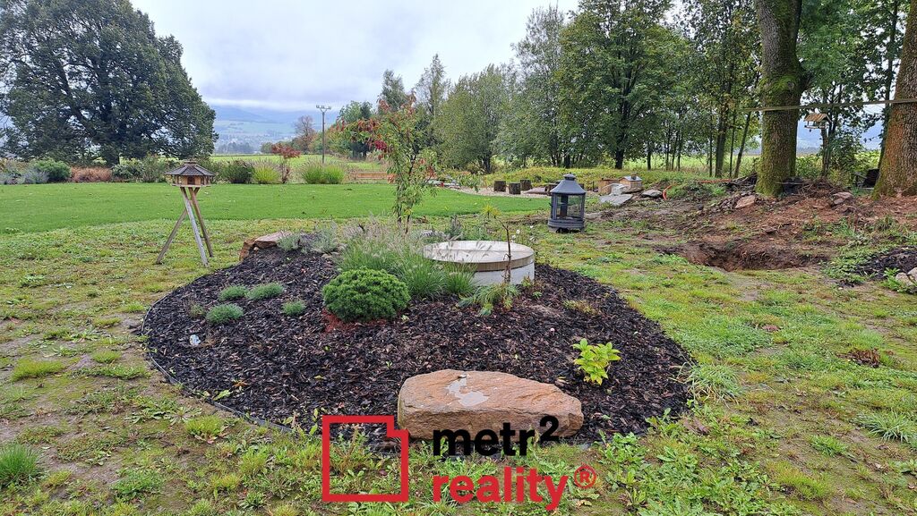 • Zhruba třetina pozemku je již upravena – zatravněná zahrada, dětský koutek, okrasný ostrůvek se studnou.