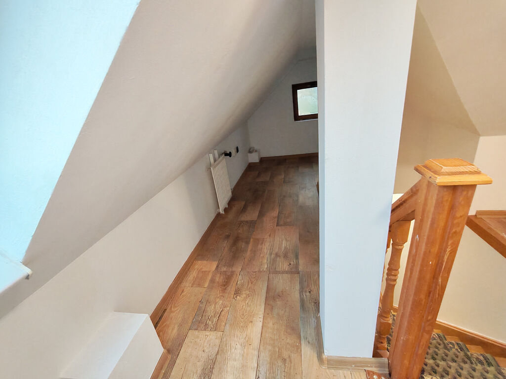 V tomto podkrovním bytě máte k dispozici 1 obytnou místnost, kuchyň, koupelnu s vanou a oddělenou toaletou, úložný prostor nad i pod schodištěm a také velkou úložnou skříň na verandě.