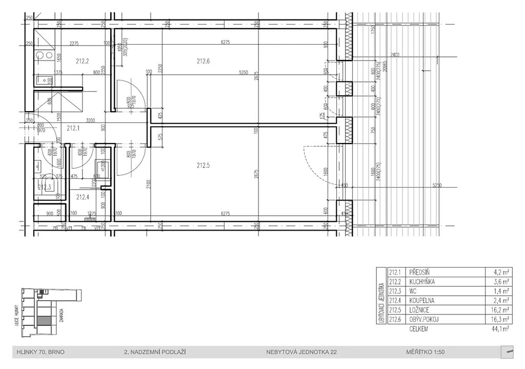 Z pozice majitele objektu nabízíme k pronájmu byt č. 22 o výměře 44,1 m² a dispozici 2+1 s terasou do vnitrobloku, nacházející se ve 2. nadzemním podlaží moderního polyfunkčního domu se dvěma výtahy. Dům je situován na prestižní adrese Hlinky 995/70, Brno, přímo u zastávek MHD „Výstaviště – hlavní vstup“ (tramvaj i trolejbus).
