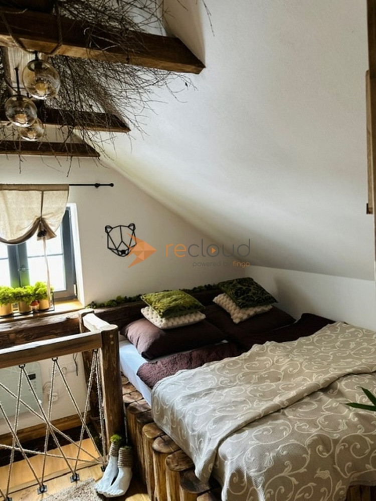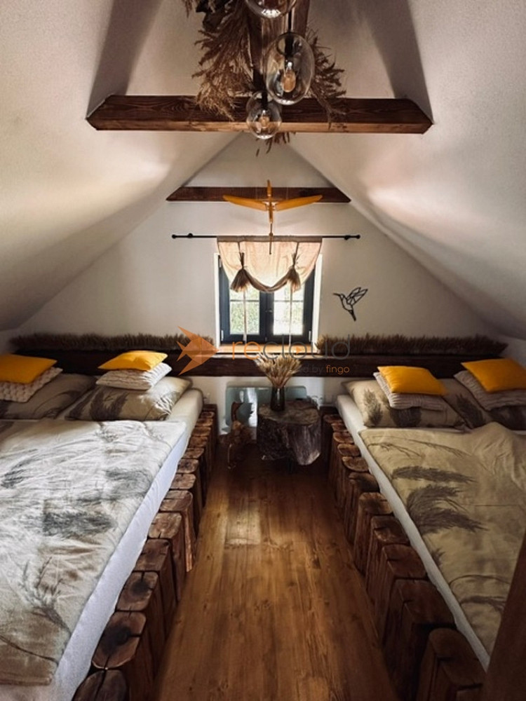 V horním patře najdete relaxační koutek s knihovnou a 2 útulné ložnice. První ložnice je s jednou manželskou postelí a je zařízena v lesním stylu. Ve druhé ložnici se nacházejí 2 manželské postele.