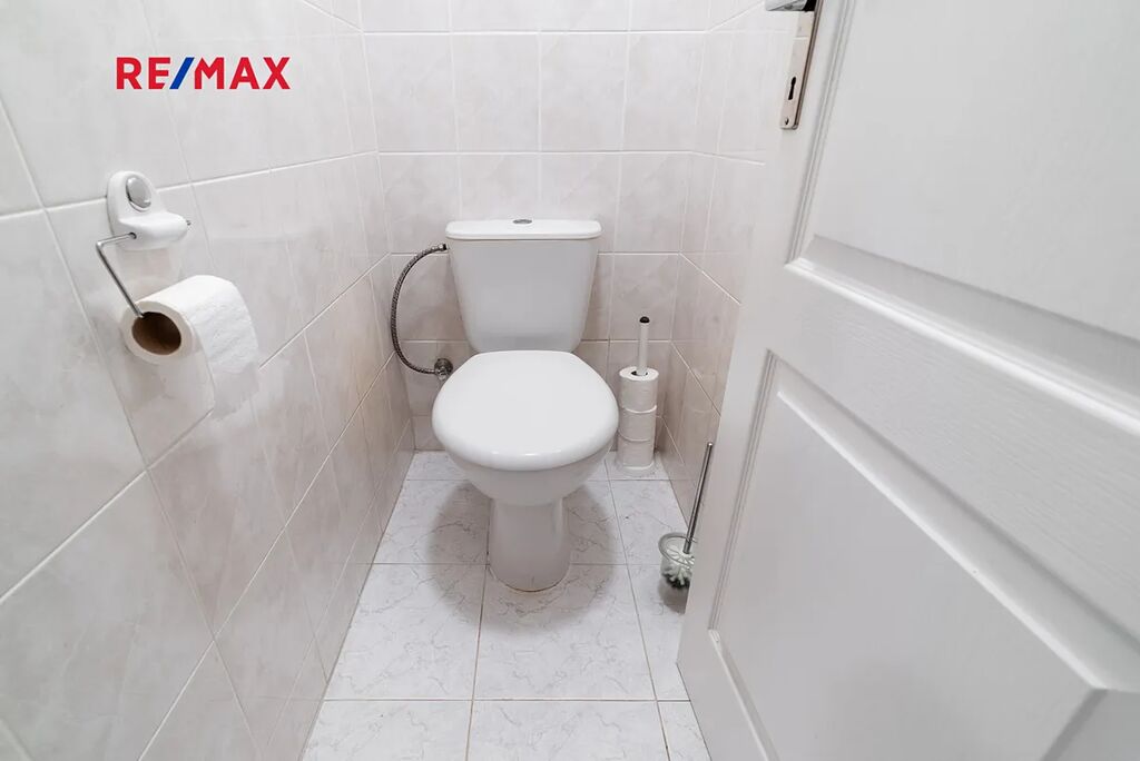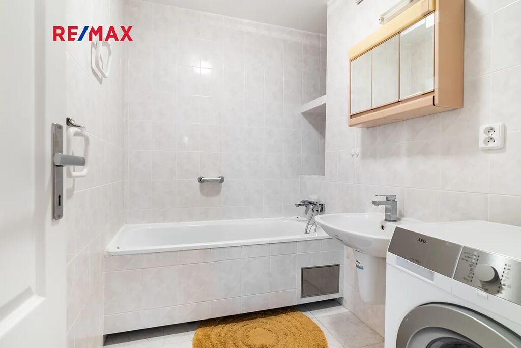 Koupelna je vybavena vanou, umyvadlem a pračkou, toaleta je řešena samostatně.