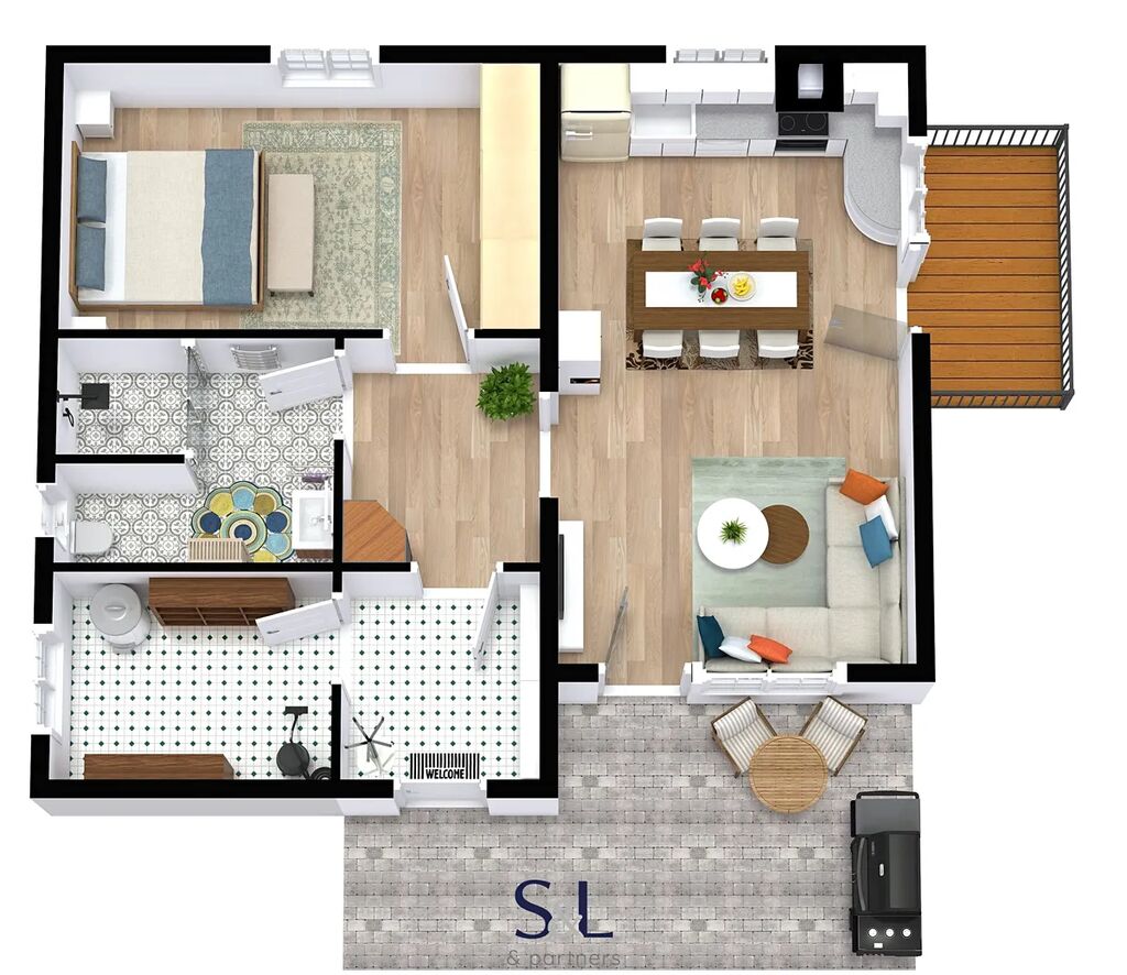 Z obývací části je vstup na terasou o velikosti 12,85 m², která umožňuje příjemné posezení s výhledem do zeleně.