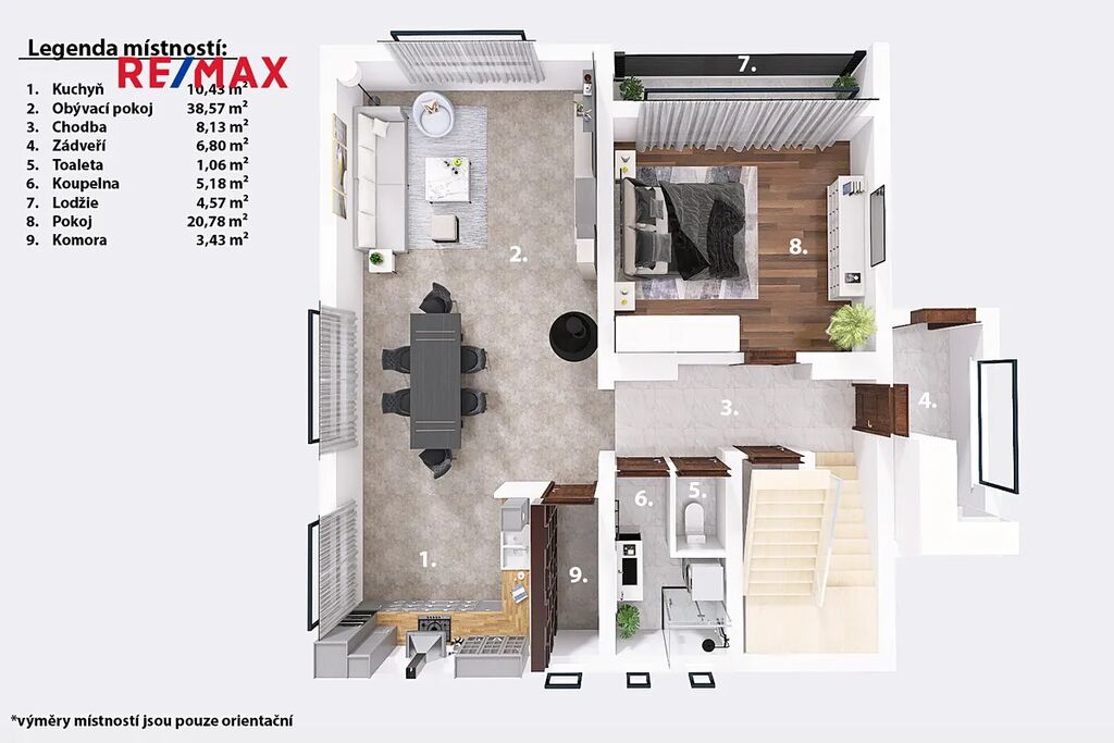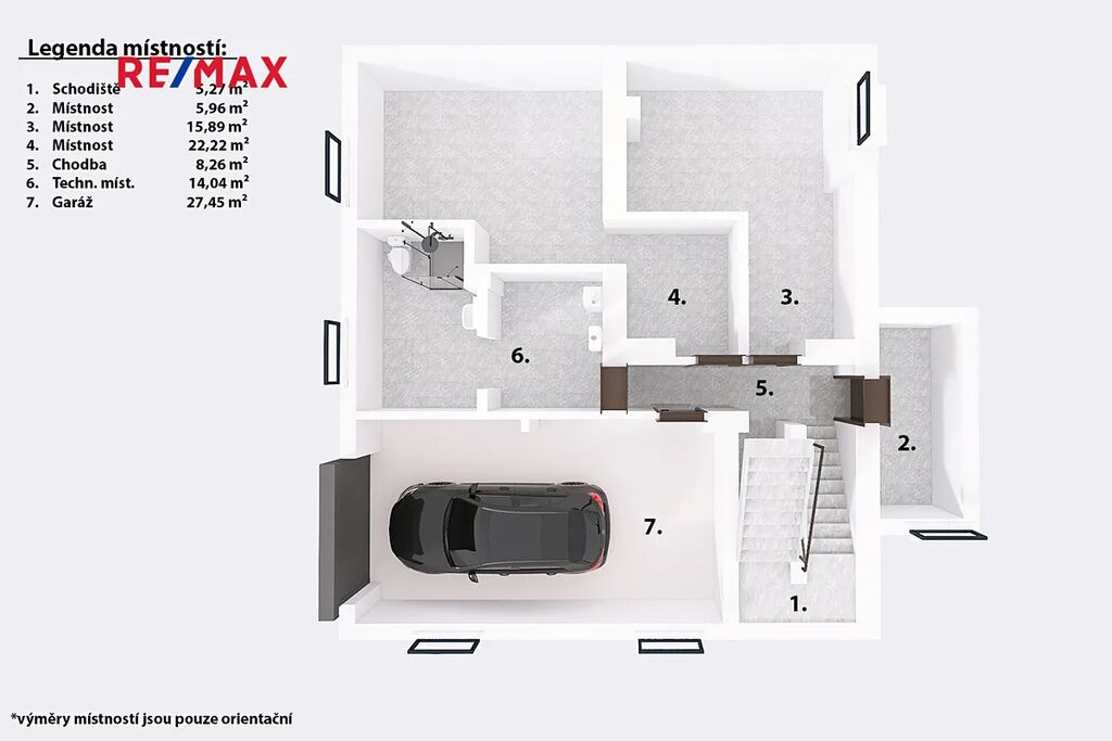 Orientační výměry jednotlivých místností jsou zmíněné v přiložených půdorysech. Spolu s tím Vám doporučujeme projít si nemovitost za pomoci 3D virtuální prohlídky, která Vám dopomůže k plné představě o rozložení jednotlivých místností.