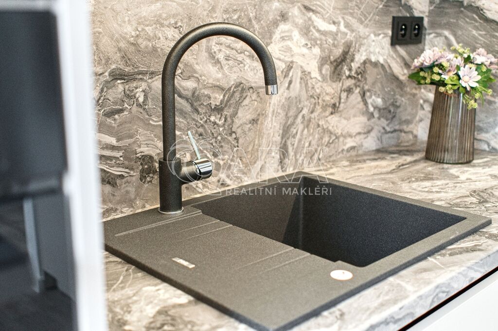 Prostorná koupelna a rohová kuchyň s úložným prostorem