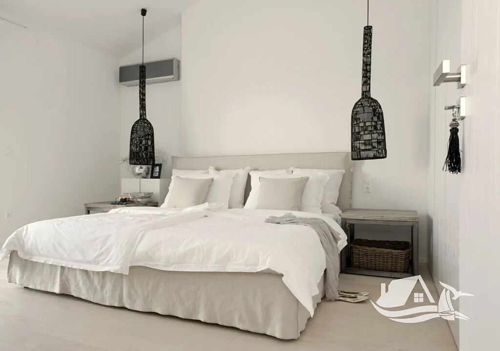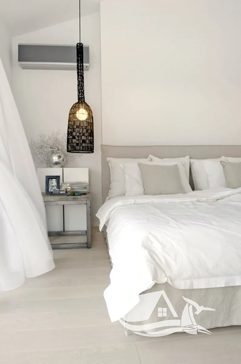 V prvním patře čeká hlavní ložnice s vlastní koupelnou a balkonem, odkud je pohled na moře skoro meditací. Druhé patro přidává další ložnici, koupelnu, technickou místnost a terasu, díky které je dům otevřený světlu i výhledům ze všech úrovní. Každý centimetr interiéru ladí s přírodou kolem, od vestavěného nábytku na míru až po jemné materiály, které nechávají vyniknout atmosféru místa.