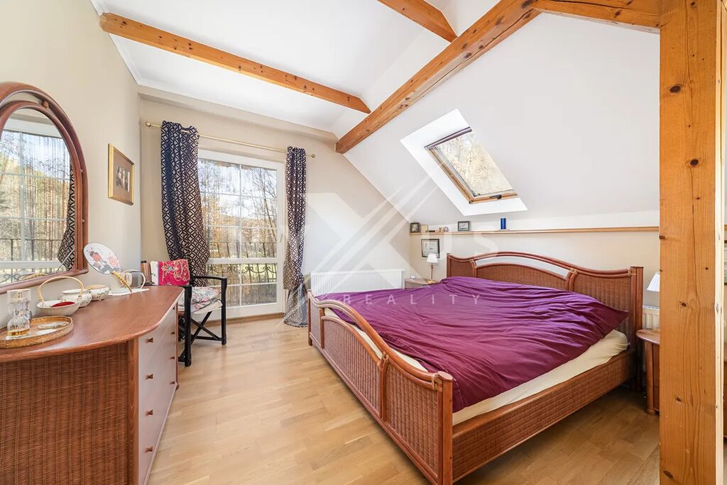 V patře o užitné ploše 82 m² se nachází prostorná hala, koupelna s vanou a dvě útulné ložnice, z nichž každá má vlastní balkon o velikosti 3 m² a kamna na dřevo.