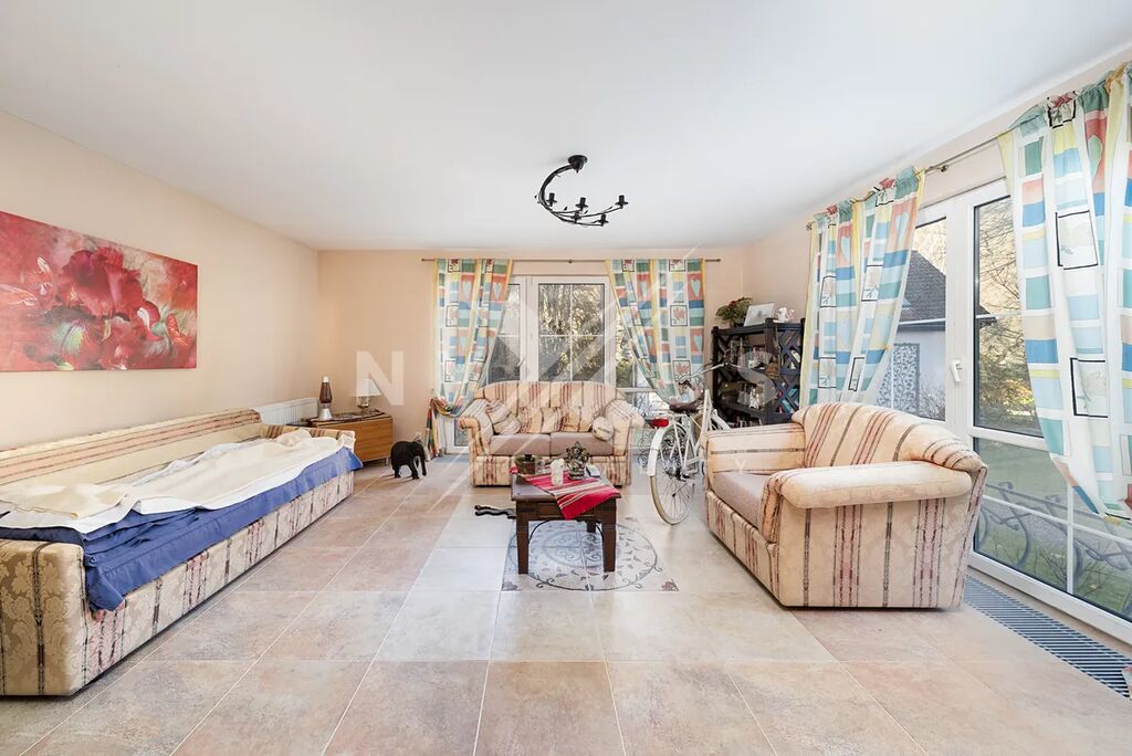 Dům poskytuje výjimečný prostor, soukromí a komfortní zázemí pro rodinné bydlení. Přízemí o velikosti 99 m² sestává z vstupní chodby, koupelny, technické místnosti a především velkým otevřeným obytným prostorem, který propojuje kuchyni, jídelnu, pracovnu a obývací pokoj s krbem. Z této části domu je přímý vstup na zasklenou terasu 9 m² s krásným výhledem do zahrady.