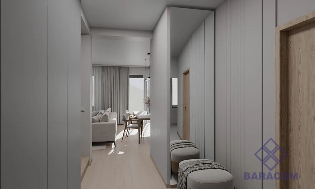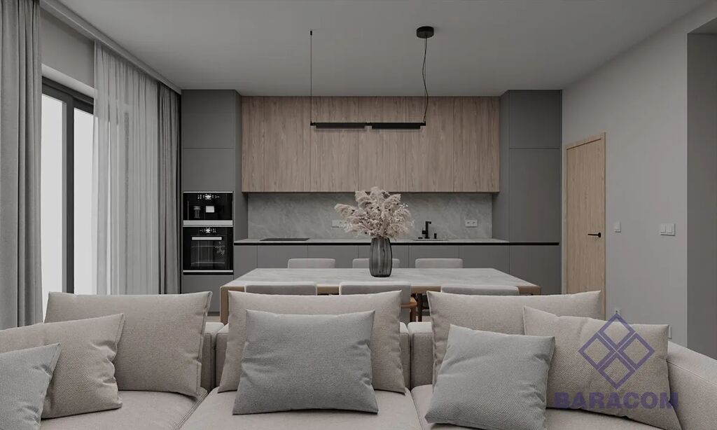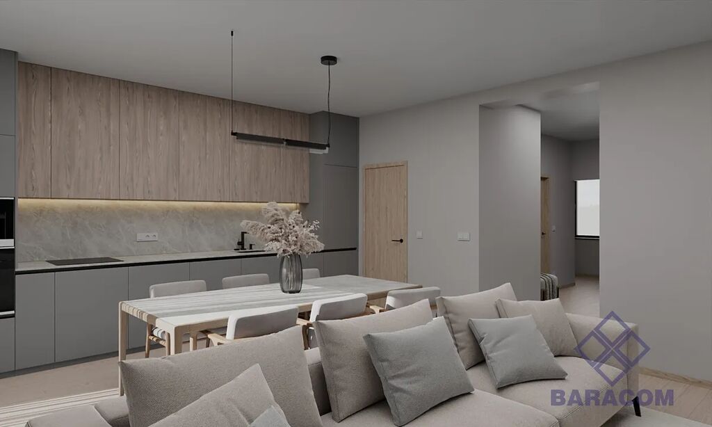 Obývací pokoj s kuchyňským koutem: Prostorná místnost se vstupem přímo na oplocenou zahradu, ideální pro rodinná setkání.