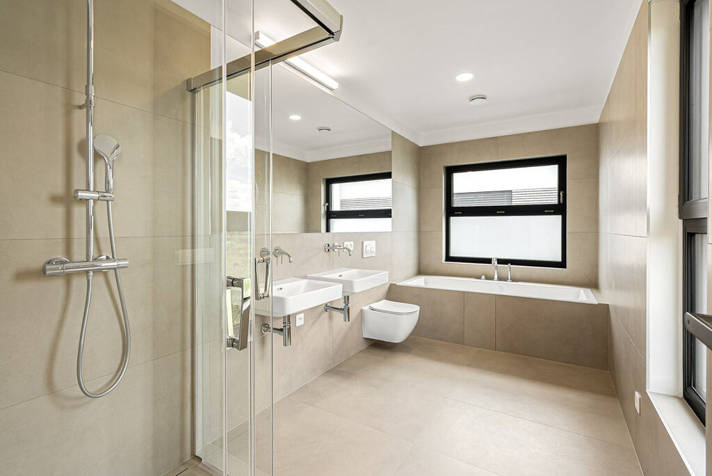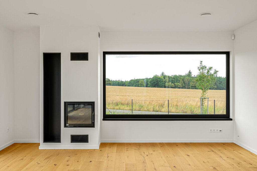 Doslova na každém kroku vás provází luxusní vybavení interiéru – třívrstvé dřevěné podlahy, velkoformátové italské dlažby a obklady 1,2 m x 0,6 m velkoformátová okna s trojskly.