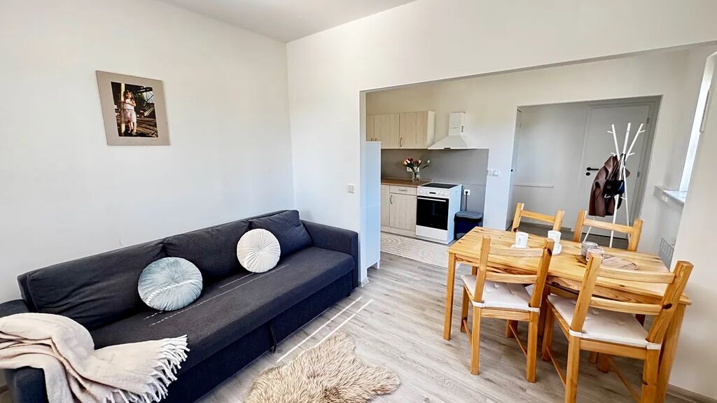 Součástí je obývací pokoj s kuchyňským koutem, ložnice, koupelna se sprchovým koutem a WC.