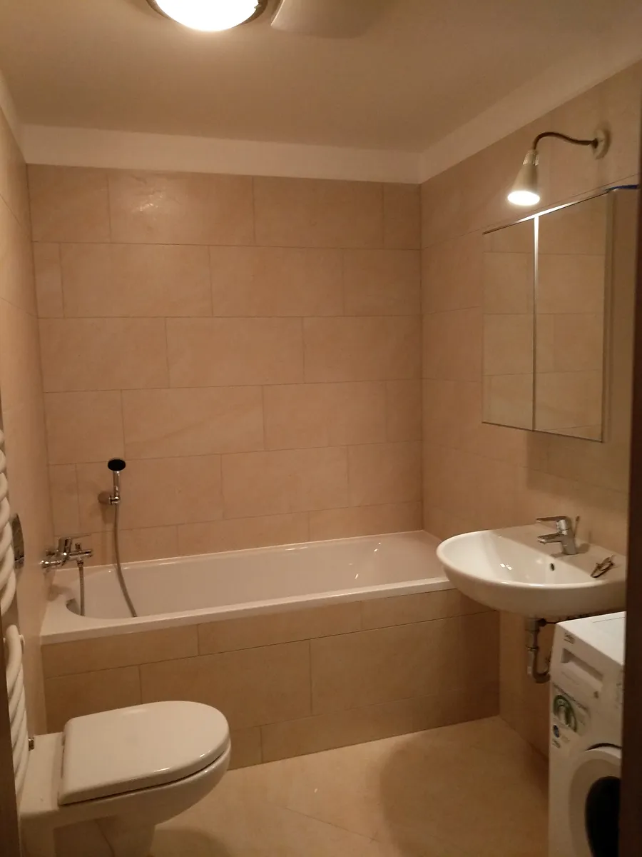 koupelnu s vanou, toaletou a pračkou,