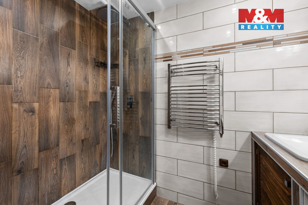 Koupelna a WC zaujmou moderním a kvalitním obkladem v dekoru dřeva.