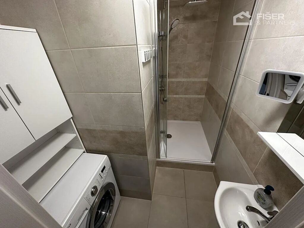 Koupelna velký sprchový kout 120 x 90 cm s kombinovanou sprchou a termostatickou baterií, zrcadlo s LED osvětlením, pračka, ventilátor s automatickým odtahem při překročení limitu vlhkosti, skříň s úložným prostorem.