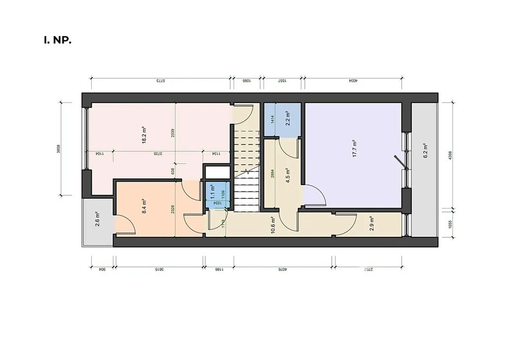 Vstupní hala je prostorná, s dostatkem místa pro úložné prostory. Vedle haly se nachází garáž, která disponuje malým pracovním pultem vhodným pro kutily. Hlavní část tohoto patra tvoří samostatný apartmán složený z obytné místnosti, vlastní kuchyně a koupelny. Z apartmánu je přímý vstup na zahradu, ke které vede také samostatný vchod nezávislý na apartmánu. WC je umístěno na chodbě. Celková užitná plocha 1. nadzemního podlaží je 61,68 m².
