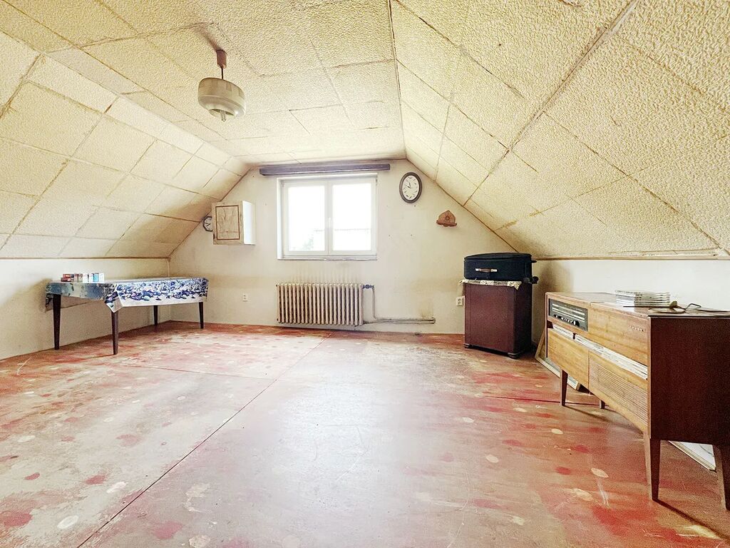 Dům má 2 nadzemní podlaží o celkové rozloze 125m², sklep, 2x garáž, 2x dílnu a prádelnu. V přízemí se nachází předsíň, obývací pokoj, ložnice, kuchyň, samostatné wc, koupelna s wc a vstup do sklepa. V podkroví naleznete tři samostatné pokoje. V suterénu domu je menší sklep s regály na potraviny. S domem sousedí dvě garáže a dvě menší dílny. Jedna z garáží je přístupná z ulice i ze dvora. Dům je zděný, je připojen na teplovodní vytápění z nedaleké elektrárny, je do něj zavedena elektřina, obecní vodovod, kanalizace a má vlastní studnu. Dodávky tepla a elektřiny jsou nyní odpojeny.