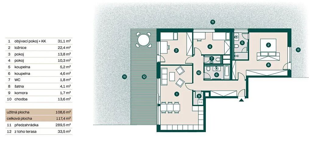 4+kk 117,4 m2 s předzahrádkou 289,5 m2 (z toho terasa 33,5 m2) v 1. nadzemním podlaží