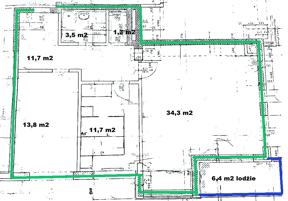 prostorný obývací pokoj s kuchyňským koutem (34 m2) a vstupem na lodžii (6,4 m2), 2x samostatný pokoj (13,8 m2 a 11,7 m2), koupelna s vanou, WC s umyvadlem zvlášť.
