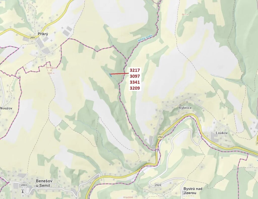 Lesní pozemky a vodní plocha o výměře 1649 m2, parcelní čísla 3217, 3097, 3341, 3209, podíl 1/1, katastrální území Benešov u Semil, obec Benešov u Semil, obec s rozšířenou působností Semily, okres Semily, Liberecký kraj.