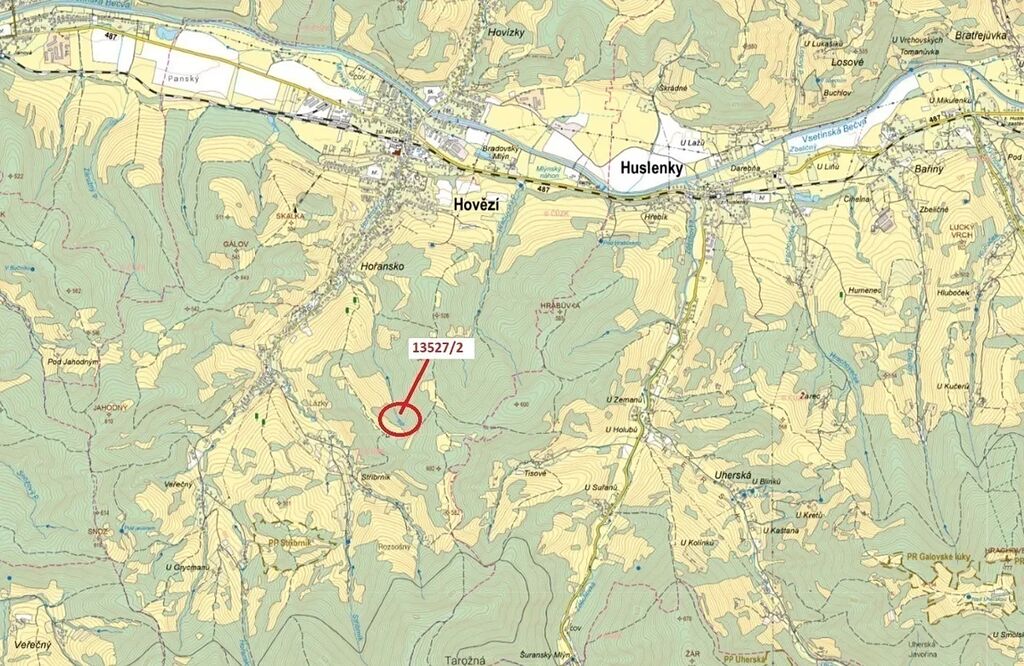 Lesní pozemek o výměře 1230 m2, parcelní číslo 13527/2, podíl 1/1, katastrální území Hovězí, obec Hovězí, obec s rozšířenou působností Vsetín, okres Vsetín, Zlínský kraj.