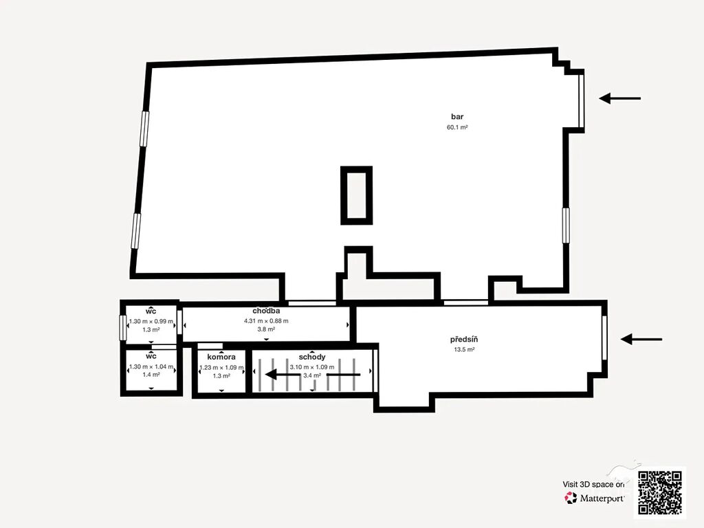 Přízemí domu o výměře 114 m² sloužilo v minulosti jako bar se sociálním zařízením. Sloup a přilehlé klenby jsou zde využity jako předělující prvek mezi jednotlivými zónami prostor. Nachází se zde ještě různý materiál, nicméně jeho vyklizení je vlastník nemovitosti připraven po domluvě případně zajistit.