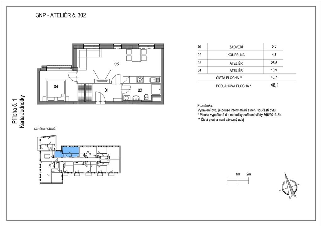 Ateliér 302 o dispozici 2+kk vám nabízí 48,1 m². Promyšlená dispozice bez zbytečných chodeb využívá byt do posledního metru.